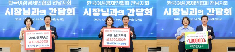 À̳¯ Çѱ¹¿©¼º°æÁ¦ÀÎÇùȸ Àü³²Áöȸ´Â °íÇâ»ç¶û±âºÎ±Ý 100¸¸ ¿øÀ», Àå¾Ö¼÷ ºÎȸÀå((ÁÖ)»ï¿ì°Ç¼³ ´ëÇ¥¡¤ÀåÈï)Àº 200¸¸ ¿øÀ» °¢°¢ Àü´ÞÇß´Ù. ¶ÇÇÑ ±¤¾ç ¿©¼º±â¾÷ÀΠȲÀº¾Æ ¹Ì·¡Áö¹Ý¿¬±¸¼Ò ´ëÇ¥´Â ¾î¸°À̺¸À°Àç´Ü¿¡ ÈÄ¿ø±Ý 100¸¸ ¿øÀ» ±âŹÇß´Ù.