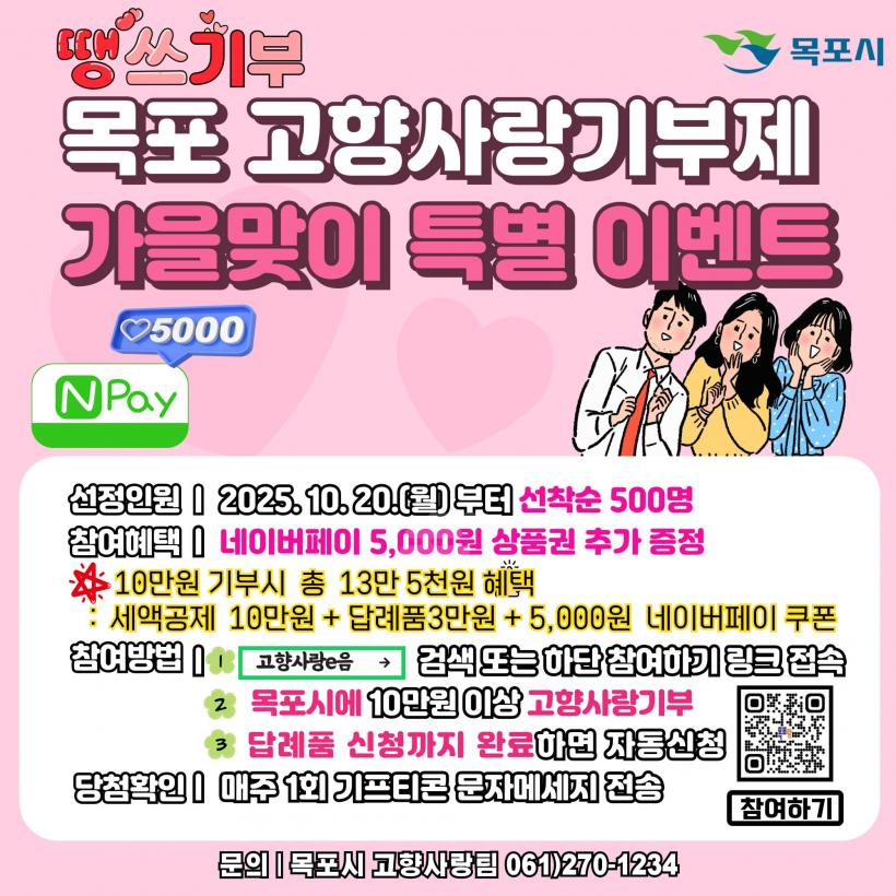 À̹ø À̺¥Æ®´Â 10¿ù 20ÀϺÎÅÍ °íÇâ»ç¶û±âºÎÁ¦¸¦ ÅëÇØ ¸ñÆ÷½Ã¿¡ 10¸¸ ¿ø ÀÌ»ó ±âºÎÇÏ°í ´ä·ÊǰÀ» ½ÅûÇÑ ±âºÎÀÚ¸¦ ´ë»óÀ¸·Î Çϸç, º°µµÀÇ ÀÀ¸ð ÀýÂ÷ ¾øÀÌ ÀÚµ¿ Âü¿©µÈ´Ù. ¼±Âø¼ø 500¸í¿¡°Ô ³×À̹öÆäÀÌ Æ÷ÀÎÆ® 5,000¿ø ÄíÆùÀÌ Áö±ÞµÈ´Ù.