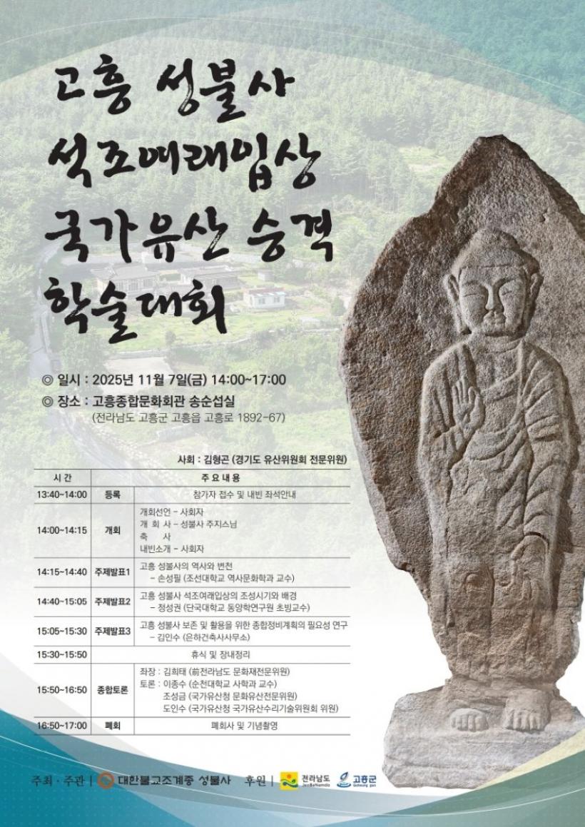 À̹ø Çмú´ëȸ´Â Àü¶ó³²µµ¿Í °íÈﱺÀÌ ÁÖÃÖÇϰí, ´ëÇѺұ³Á¶°èÁ¾ ¼ººÒ»ç¿Í û¶÷¹®ÈÀ¯»ê¿¬±¸¿øÀÌ ÁÖ°üÇØ ÁøÇàÇÒ ¿¹Á¤ÀÌ´Ù. Àü¶ó³²µµ À¯Çü¹®ÈÀ¯»ê Á¦250È£ÀÎ ¡®°íÈï ¼ººÒ»ç ¼®Á¶¿©·¡ÀÔ»ó¡¯ÀÇ ±¹°¡À¯»êÀû °¡Ä¡¸¦ ÀçÆò°¡Çϰí, ¼ººÒ»ç(ÁÖÁö Áö¾Ï½º´Ô)¸¦ ºñ·ÔÇÑ °íÈï Áö¿ª ºÒ±³¹®ÈÀ¯»êÀÇ ¿ª»çÀû Àǹ̸¦ ÀçÁ¶¸íÇϱâ À§ÇØ ¸¶·ÃµÆ´Ù.