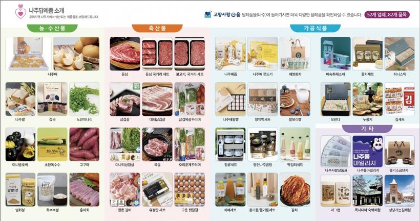 ³ªÁֽô ±âºÎÀÚ¿¡°Ô Á¦°øÇÒ ´ä·ÊǰÀ¸·Î 52°³ °ø±Þ¾÷ü¿Í Çù¾àÀ» ¸Î¾î ´ä·Êǰ¸ôÀ» ¿î¿µÇϰí ÀÖ´Ù. ´ä·ÊǰÀº ³ªÁÖ¹è, ³ªÁÖ½Ò, È«¾îȸ µîÀ¸·Î ±¸¼ºµÈ ³ó¡¤¼ö»ê¹°°ú µî½É, »ï°ã»ì, ¸ñ»ì µîÀ¸·Î ±¸¼ºµÈ Ãà»ê¹°, ¹èÁó, ³ªÁÖ¹è Â˵å±â, ¹è ½ÖÈÂ÷ µîÀ¸·Î ±¸¼ºµÈ °¡°ø½ÄǰÀ» ºñ·ÔÇÏ¿© ³ªÁֽó» »ó°¡¿¡¼ ÀÚÀ¯·Ó°Ô »ç¿ëÇÒ ¼ö ÀÖ´Â ³ªÁÖ»ç¶û»óǰ±Ç µîÀÌ °íÇâ»ç¶ûeÀ½ ´ä·Êǰ ¸ô¿¡ µî·ÏµÇ¾î ÀÖ´Ù.