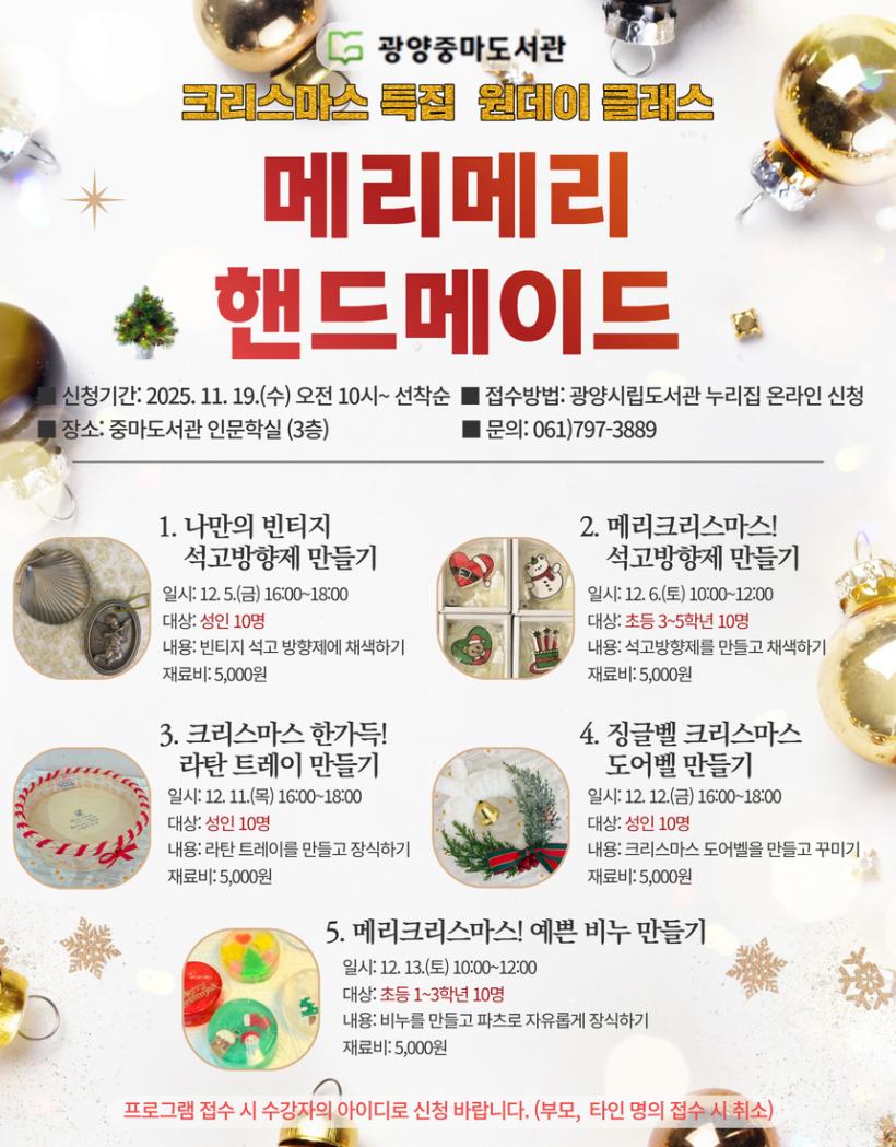 À̹ø °Á´ ũ¸®½º¸¶½º¸¦ ÁÖÁ¦·Î ÇÑ ÇÚµå¸ÞÀÌµå ¼Òǰ ¸¸µé±â ÇÁ·Î±×·¥À¸·Î ±¸¼ºµÆ´Ù. ¼¼ºÎ °Á´ ¡ãÃʵî 1~3Çг⠴ë»ó ¡®¸Þ¸®Å©¸®½º¸¶½º! ¿¹»Û ºñ´© ¸¸µé±â¡¯ ¡ãÃʵî 3~5Çг⠴ë»ó ¡®¸Þ¸®Å©¸®½º¸¶½º! ¼®°í ¹æÇâÁ¦ ¸¸µé±â¡¯ ¡ã¼ºÀÎ ´ë»ó ¡®³ª¸¸ÀÇ ºóƼÁö ¼®°í ¹æÇâÁ¦ ¸¸µé±â¡¯ ¡ã¡®Å©¸®½º¸¶½º ÇѰ¡µæ! ¶óź Æ®·¹ÀÌ ¸¸µé±â¡¯ ¡ã¡®Â¡±Ûº§ Å©¸®½º¸¶½º µµ¾îº§ ¸¸µé±â¡¯ ÃÑ 5°³´Ù.