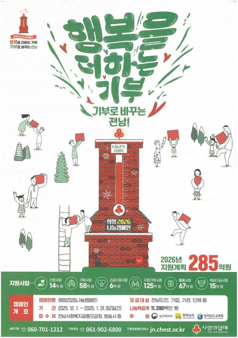 ¡®Èñ¸Á2026³ª´®Ä·ÆäÀΡ¯Àº ¡°ÇູÀ» ´õÇÏ´Â ±âºÎ, ±âºÎ·Î ¹Ù²Ù´Â ¼øÃµ¡±À̶ó´Â ½½·Î°ÇÀ¸·Î ÁøÇàµÇ¸ç, ¸ñÇ¥¾×Àº Àü³â 9¾ï 6,700¸¸¿ø ´ëºñ 3% Áõ°¡ÇÑ 10¾ï ¿øÀÌ´Ù.