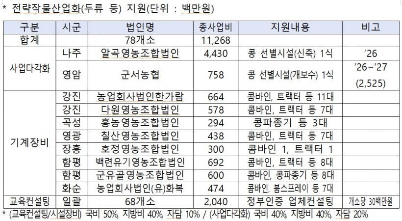 [°ø°£´º½º = ±è¼ö±Ù±âÀÚ] Àü¶ó³²µµ´Â 2026³â Á¤ºÎ Àü·«ÀÛ¹°»ê¾÷È Áö¿ø»ç¾÷ °ø¸ð¿¡¼ ±³À°¡¤ÄÁ¼³ÆÃ 68°³¼Ò, ½Ã¼³¡¤Àåºñ 8°³¼Ò, »ç¾÷´Ù°¢È 2°³¼Ò µî ÃÑ 78°³¼Ò°¡ ¼±Á¤µÅ 113¾ï ¿øÀÇ »ç¾÷ºñ¸¦ È®º¸Çß´Ù°í ¹àÇû´Ù.