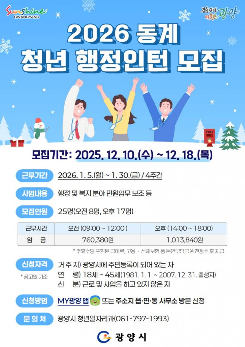 ÇàÁ¤ÀÎÅÏ ¸ðÁý°ú °ü·ÃÇØ ÀÚ¼¼ÇÑ »çÇ×Àº ±¤¾ç½Ã û³âÀÏÀÚ¸®°ú(¢Ï061-797-1993)·Î ¹®ÀÇÇÏ¸é µÈ´Ù.
