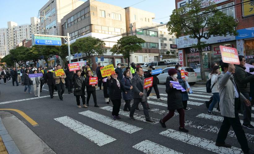 ÇÑÆí, Âü¼®ÀÚµéÀº Çà»ç¸¦ ÅëÇØ °áÀǸ¦ ´ÙÁö°í, ¿©¼ö½ÃÀÇȸ¸¦ Ãâ¹ßÇØ KB±¹¹ÎÀºÇà°ú (±¸)¼Û¿ø¹éÈÁ¡, ÇØ¾ç°æÂû¼, ¿©¼öMBC »ï°Å¸®±îÁö À̾îÁö´Â ¾à 1.5km ±¸°£¿¡¼ ¡®¿©¼öMBC ¼øÃµÀÌÀü ¹Ý´ë¡¯ µîÀÇ ±¸È£¸¦ ¿ÜÄ¡¸ç °Å¸® ÇàÁøÀ» ÆîÃÆ´Ù.