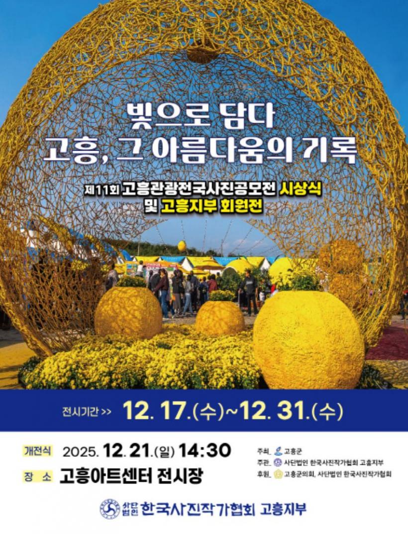 ÇÑÆí, Á¦11ȸ °íÈï°ü±¤ Àü±¹ »çÁø °ø¸ðÀü ½Ã»ó½ÄÀº ¿À´Â 12¿ù 21ÀÏ ¿ÀÈÄ 2½Ã 30ºÐ, °íÈï¾ÆÆ®¼¾ÅÍ 1Ãþ Àü½Ã½Ç¿¡¼ °³ÃÖµÉ ¿¹Á¤ÀÌ´Ù.