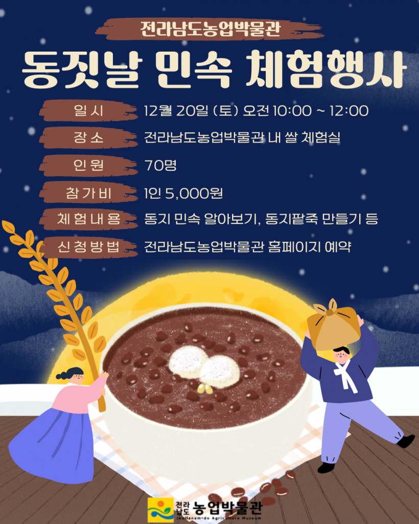 Çà»ç´Â µ¿Áþ³¯ÀÇ Àý±âÀû ÀÇ¹Ì¿Í ÀüÅë ¹Î¼ÓÀ» ¼Ò°³Çϰí, µ¿ÁöÆÏÁ×À» ¸¸µé¾î º¸´Â üÇè Á᫐ ÇÁ·Î±×·¥À¸·Î ±¸¼ºµÆ´Ù. ¼±Âø¼ø 70¸íÀ̸ç, Âü°¡ ½ÅûÀº Àü³²µµ³ó¾÷¹Ú¹°°ü ´©¸®Áý(http://www.jam.go.kr)¿¡ ÇÏ¸é µÈ´Ù. Âü°¡ºñ´Â ¹«·á´Ù.