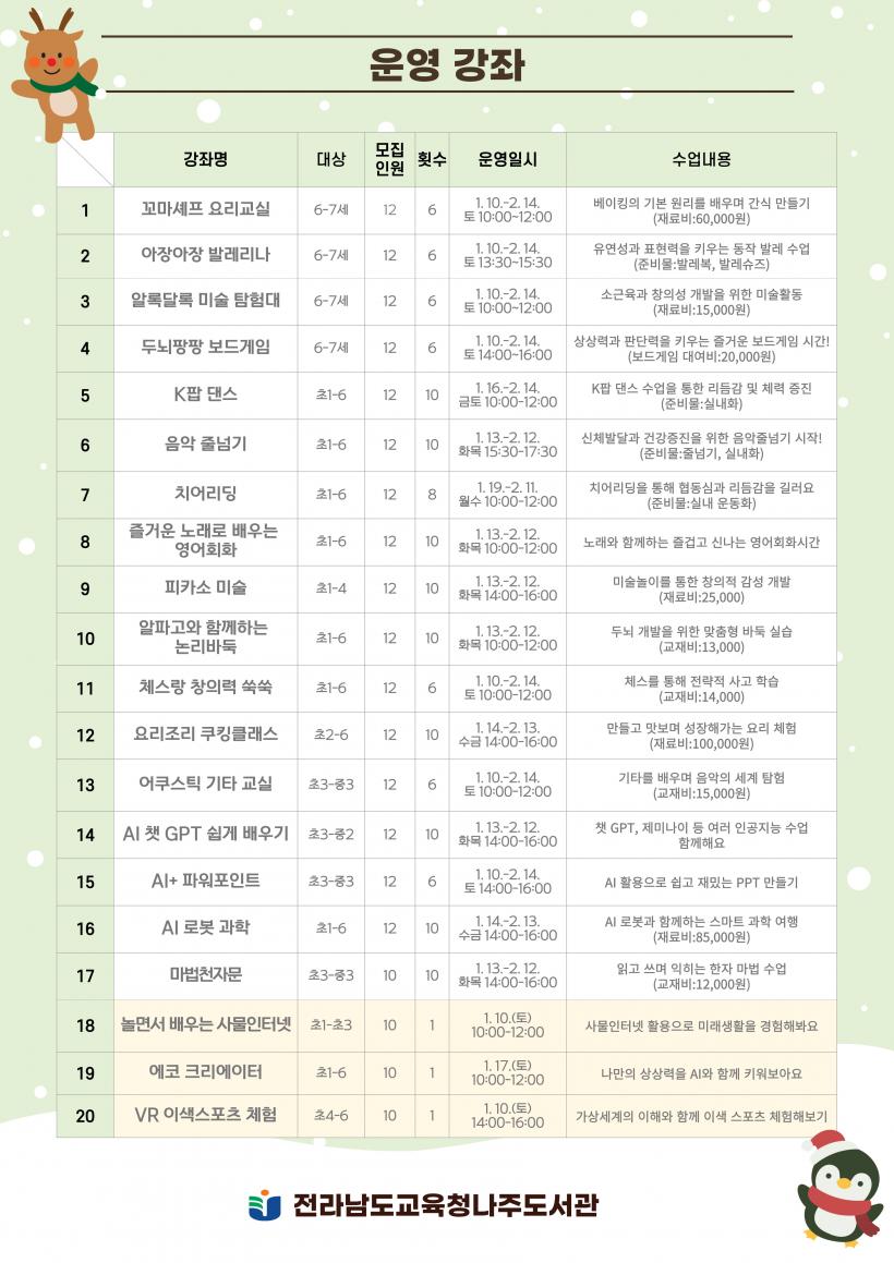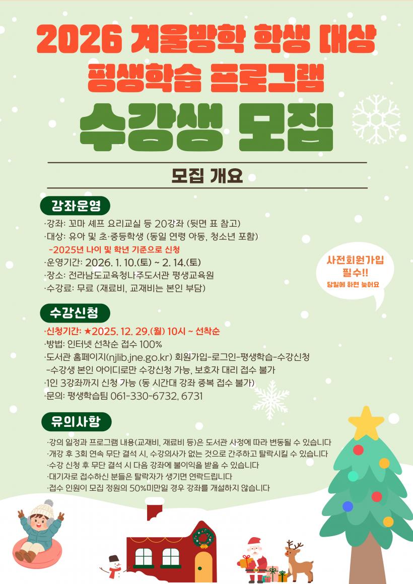 Á¢¼ö´Â ¿À´Â 12¿ù 29ÀÏ(¿ù) 10½ÃºÎÅÍ ¼±Âø¼øÀ̸ç, Àü¶ó³²µµ±³À°Ã»³ªÁÖµµ¼°ü ´©¸®Áý(njlib.jne.go.kr)¿¡¼ ½ÅûÇÏ¸é µÈ´Ù. ¿î¿µ ±â°£Àº 2025³â 1¿ù 10ÀϺÎÅÍ 2¿ù 14ÀϱîÁöÀ̰í, ¼ö°·á´Â ¹«·áÀ̸ç Àç·áºñ ¹× ±³Àçºñ´Â º»ÀÎ ºÎ´ãÀÌ´Ù.