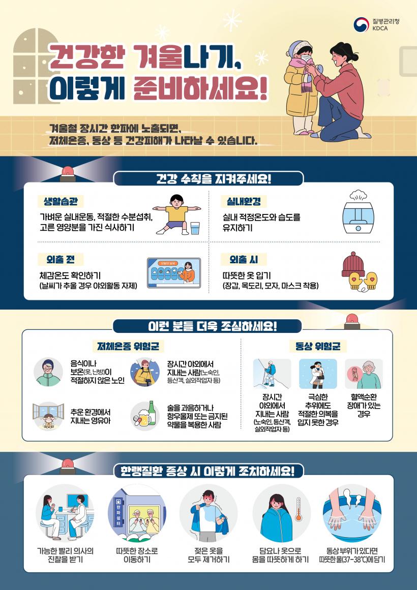 °í·ÉÀÚ¿Í ¸¸¼ºÁúȯÀÚ´Â °Ü¿ïö ÃßÀ§¿¡ Ãë¾àÇÑ ¸¸Å ±â¿ÂÀÌ ³·Àº ³¯¿¡´Â ¹«¸®ÇÑ ¿ÜÃâÀ» ÇÇÇϰí ü¿Â À¯Áö¿¡ °¢º°È÷ ½Å°æ½á¾ß ÇÑ´Ù. ¾Æ¿ï·¯ ÃæºÐÇÑ ¼öºÐ ¼·Ãë¿Í ÀûÁ¤ÇÑ ½Ç³» ¿Â¡¤½Àµµ À¯Áö, ¹æÇÑ¿ëǰ Âø¿ë µî »ýȰ ¼Ó ¿¹¹æ¼öÄ¢À» ²ÙÁØÈ÷ ½ÇõÇÏ´Â °ÍÀÌ ÇÑ·©Áúȯ ¿¹¹æ¿¡ µµ¿òÀÌ µÈ´Ù.