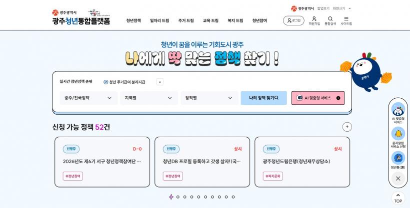 ±¤ÁÖû³âÅëÇÕÇ÷§ÆûÀº ÀÏÀÚ¸®¡¤ÁÖ°Å¡¤±³À°¡¤º¹Áö¹®È µî ´Ù¾çÇÑ Ã»³âÁ¤Ã¥ Á¤º¸¸¦ ÀΰøÁö´É(AI) ¸ÂÃãÇü ¼ºñ½º·Î Á¦°øÇϰí, Á¤Ã¥ °Ë»öºÎÅÍ ½Åû±îÁö ¿ø½ºÅéÀ¸·Î °¡´ÉÇϵµ·Ï °³ÆíÇÑ °ÍÀÌ Æ¯Â¡ÀÌ´Ù.