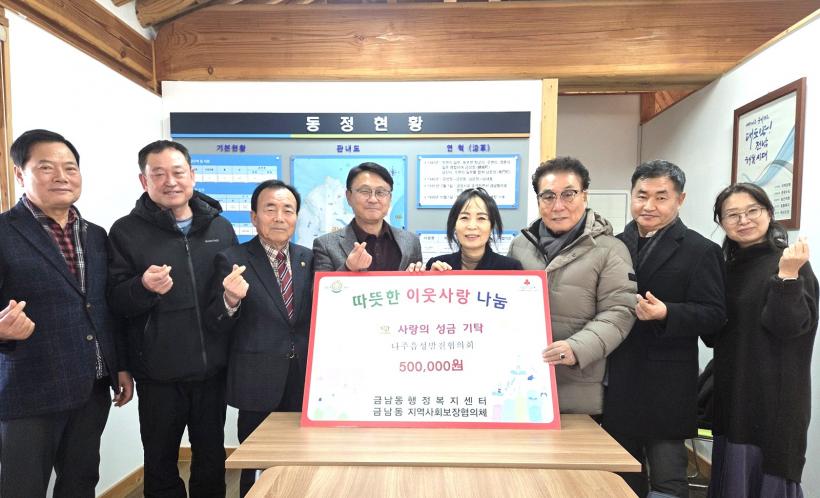 ³ªÁÖÀ¾¼º¹ßÀüÇùÀÇȸ(ȸÀå °í¹ÌÈ)µµ ÀÌ °°Àº ³ª´® Çà·Ä¿¡ µ¿ÂüÇß´Ù. 26ÀÏ ÀÌ¿ôµ½±â ¼º±Ý 50¸¸ ¿øÀ» ±Ý³²µ¿¿¡ Àü´ÞÇß´Ù. ÇùÀÇȸ´Â ÀÌ¾î ¼ººÏµ¿¿¡ 50¸¸ ¿ø, ¼Û¿ùµ¿ 20¸¸ ¿øÀ» °¢°¢ ±âŹÇÏ¸ç ¿¬¸» ÀÌ¿ôµ½±â¿¡ ÈûÀ» º¸ÅÉ´Ù.