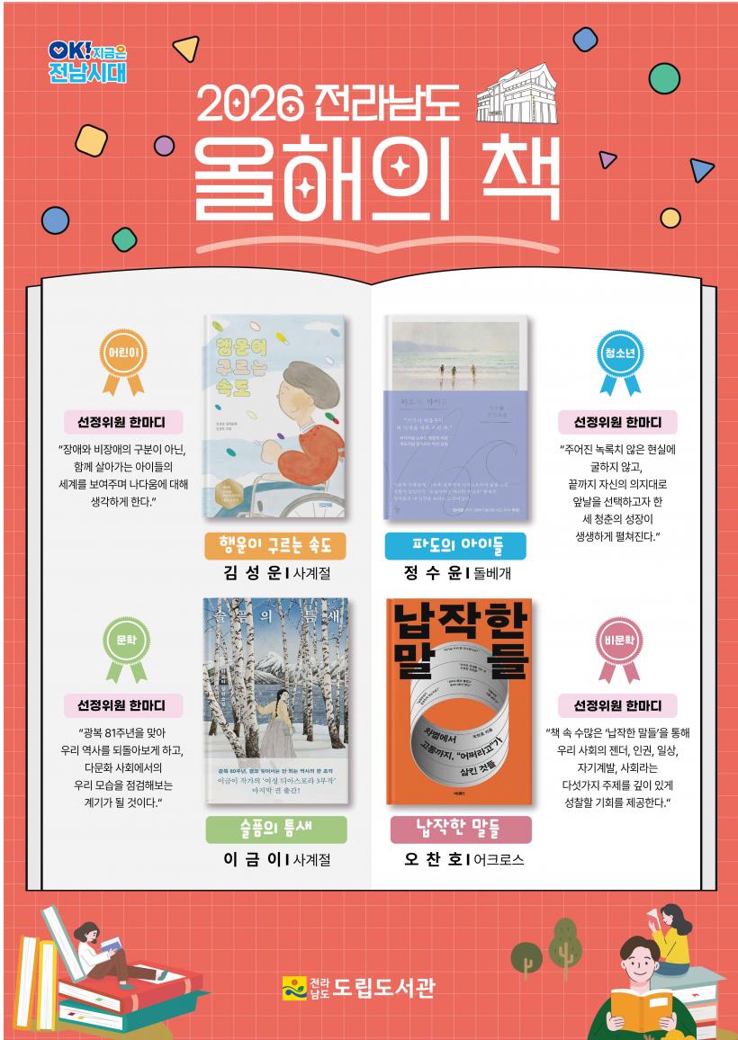 ¼±Á¤ µµ¼´Â ¹®ÇС¤ºñ¹®ÇС¤Ã»¼Ò³â¡¤¾î¸°ÀÌ 4°³ ºÐ¾ß °¢ 1±Ç¾¿À¸·Î, ¡®½½ÇÄÀÇ Æ´»õ¡¯, ¡®³³ÀÛÇÑ ¸»µé¡¯, ¡®ÆÄµµÀÇ ¾ÆÀ̵顯, ¡®Çà¿îÀÌ ±¸¸£´Â ¼Óµµ¡¯´Ù.