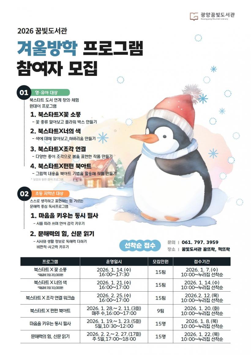 ÇÑÆí, ²Þºûµµ¼°ü °Ü¿ï¹æÇÐ ÇÁ·Î±×·¥Àº ¹æÇÐ ±â°£ÀÎ 1~2¿ù ¿î¿µµÈ´Ù. ¿µÀ¯¾Æ ´ë»ó ÇÁ·Î±×·¥Àº ¼ö¾÷ ½ÃÀÛ 7ÀÏ ÀüºÎÅÍ ¸ðÁýÇϸç, ÃÊµî ´ë»ó ÇÁ·Î±×·¥ÀÎ ¡®¸¶À½À» Ű¿ì´Â µ¿½Ã Çʻ硯¿Í ¡®¹®ÇØ·ÂÀÇ Èû, ½Å¹® Àб⡯´Â °¢°¢ 1¿ù 8Àϰú 21ÀÏ ¿ÀÀü 10½ÃºÎÅÍ Á¢¼ö¸¦ ½ÃÀÛÇÑ´Ù.