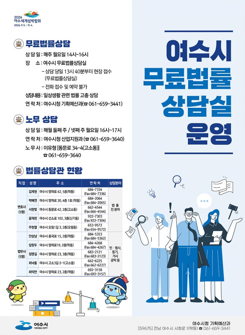 ¹ý·ü Á¢±ÙÀÌ ¾î·Á¿î ½Ã¹ÎµéÀ» À§ÇØ Àü³² ÃÖÃÊ·Î 1999³âºÎÅÍ ¹«·á¹ý·ü»ó´ã½ÇÀ» ¿î¿µÇØ ¿ÔÀ¸¸ç, ¿ÃÇØµµ º¯È£»ç 5¸í°ú ¹ý¹«»ç 5¸íÀ» ¹«·á¹ý·ü»ó´ã°üÀ¸·Î À§ÃËÇÏ°í ½Ç½ÃÇÑ´Ù. ¿©¼ö½Ã´Â Áö³ 2025³â ÇÑ ÇØ ÃÑ 559°ÇÀÇ ¹ý·ü »ó´ãÀ» ½Ç½ÃÇÏ¿´´Ù.