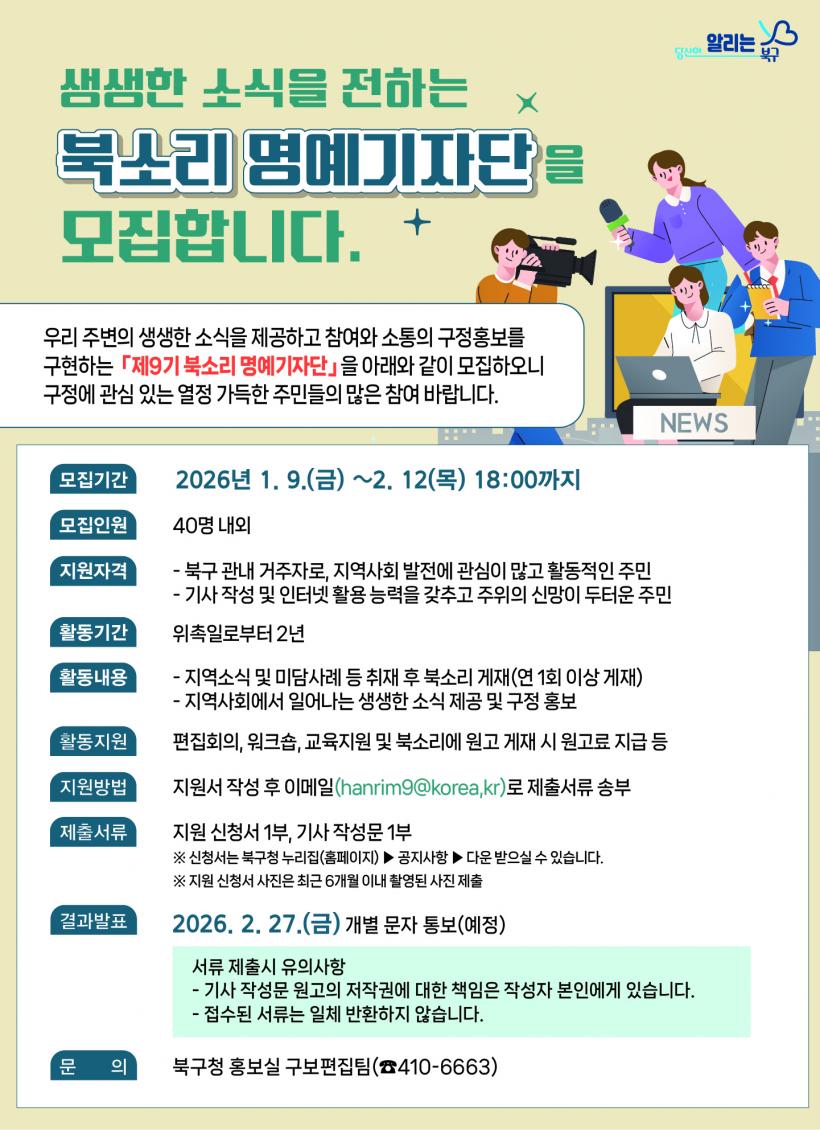 À̹ø ¸ðÁý¿¡¼´Â Á¦9±â ¸í¿¹±âÀÚ´Ü 40¿© ¸íÀ» ¼±¹ßÇÒ °èȹÀÌ´Ù. Áö¿ª»çȸ¿¡ °ü½ÉÀÌ ¸¹°í ±â»ç ÀÛ¼º ¹× ÀÎÅÍ³Ý È°¿ë ´É·ÂÀ» °®Ãá ºÏ±¸ ÁÖ¹ÎÀ̶ó¸é ´©±¸³ª ½ÅûÇÒ ¼ö ÀÖ´Ù.