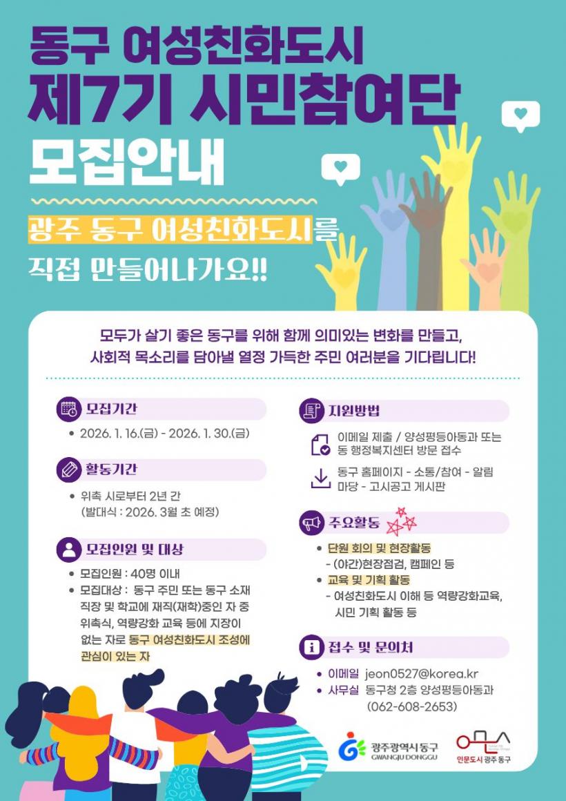Á¦7±â ½Ã¹ÎÂü¿©´ÜÀº µ¿±¸¿¡ ÁÖ¼Ò¸¦ µÎ°í Àְųª µ¿±¸ ¼ÒÀç Á÷À塤Çб³¿¡ ´Ù´Ï´Â »ç¶÷À» ´ë»óÀ¸·Î °ø°³ ¸ðÁýÇϸç, 40¸í À̳»·Î ±¸¼ºµÉ ¿¹Á¤ÀÌ´Ù. À§ÃË ±â°£Àº ¿ÃÇØ 3¿ùºÎÅÍ ¿À´Â 2028³â 2¿ù±îÁö 2³â°£ÀÌ´Ù.