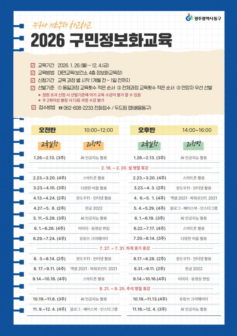 ¿ÃÇØ ±¸¹Î Á¤º¸È ±³½ÇÀº µ¿±¸º¸°Ç¼Ò 4Ãþ ±¸¹Î Á¤º¸È ±³À°Àå¿¡¼ ¿ÀÀü¡¤¿ÀÈÄ 2°³ ¹ÝÀ¸·Î ¿î¿µµÇ¸ç, ÁֹεéÀÌ Àϻ󿡼 ¹Ù·Î Ȱ¿ëÇÒ ¼ö ÀÖ´Â ½Ç»ýȰ Á᫐ °úÁ¤µé·Î ±¸¼ºµÆ´Ù.