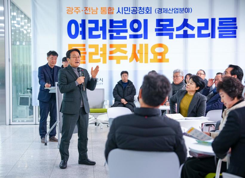±¤ÁÖ±¤¿ª½Ã(½ÃÀå °±âÁ¤)´Â 26ÀÏ ±¤ÁÖâ¾÷°ÅÁ¡ÀÎ ºÏ±¸ ½ºÅ×ÀÌÁö(ºû°íÀ»Ã¢¾÷½ºÅ×À̼Ç)¿¡¼ ¡®±¤ÁÖÀü³² ÇàÁ¤ÅëÇÕ °æÁ¦¡¤»ê¾÷ ºÐ¾ß Á÷´Éº° ½Ã¹Î°øÃ»È¸¡¯¸¦ ¿°í °æÁ¦´Üü, »ê¾÷°è, ³ó¾÷ÀÎ µî °¢°è ÀǰßÀ» Æø³Ð°Ô ûÃëÇß´Ù.