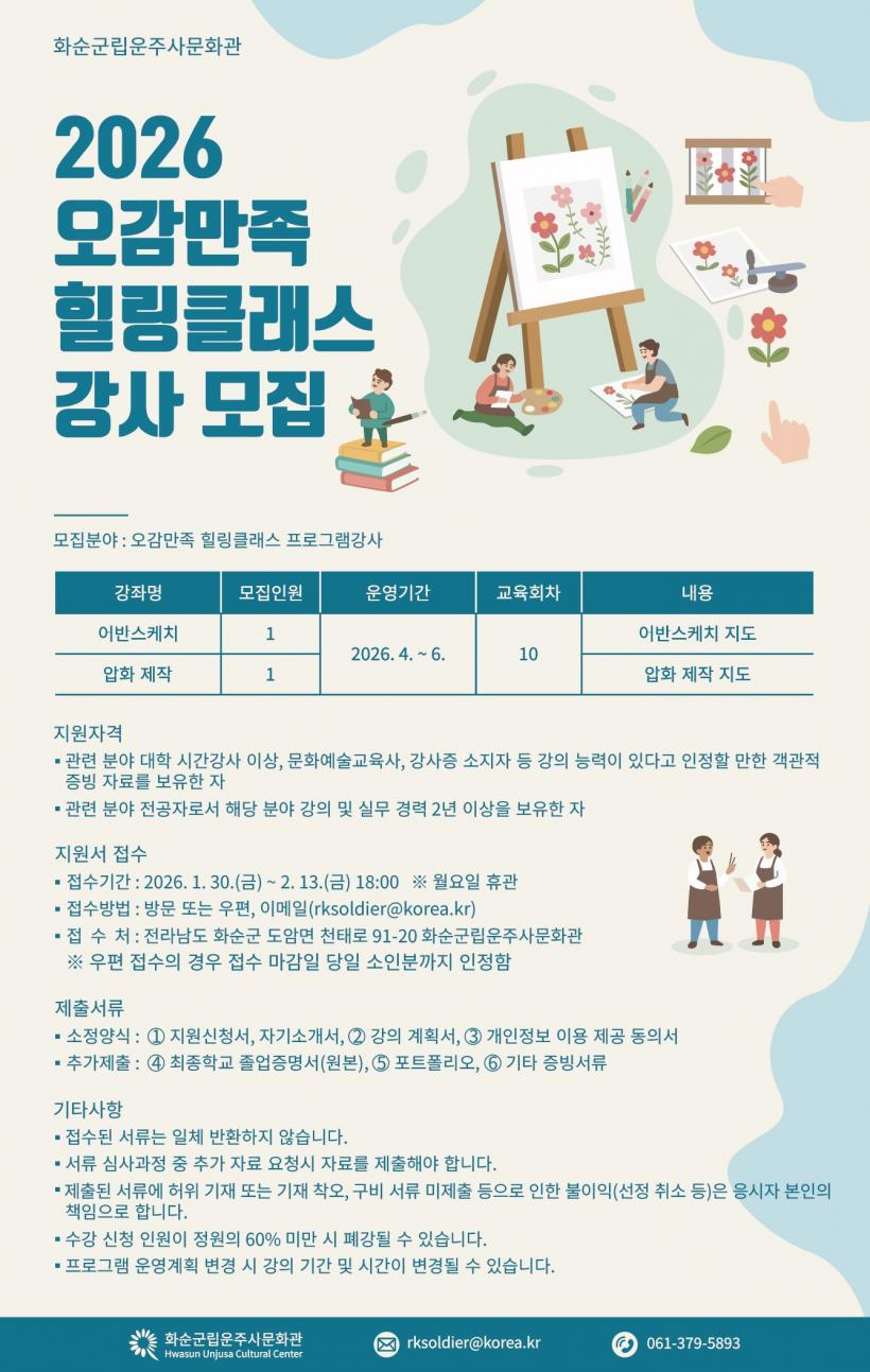 À̹ø °»ç ¸ðÁýÀº ¼ºÀÎ ´ë»ó ¹®È¿¹¼ú Èú¸µ ±³À° ÇÁ·Î±×·¥ ¿î¿µÀ» À§ÇÑ °ÍÀÌ´Ù. ¿¹¼ú Ȱµ¿À» ÅëÇØ ÀÏ»óÀÇ °¨°¢À» ȸº¹Çϰí Á¤¼Àû ¾ÈÁ¤À» µµ¿ï ¼ö ÀÖ´Â ¿ª·® ÀÖ´Â °»ç¸¦ ¼±¹ßÇÒ °èȹÀÌ´Ù.