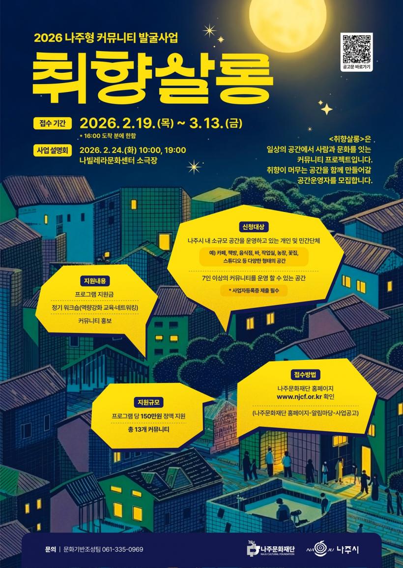 Àç´ÜÀº ½Ã¹Î ÁÖµµÀÇ »ýȰ¹®È¸¦ Ȱ¼ºÈÇϰí Áö¿ª ±â¹Ý Ä¿¹Â´ÏƼ¸¦ ¹ß±¼ ¹× À°¼ºÇϱâ À§ÇØ 2026 ³ªÁÖÇü Ä¿¹Â´ÏƼ ¹ß±¼»ç¾÷ ¡®ÃëÇâ»ì·Õ¡¯¿¡ Âü¿©ÇÒ °ø°£¿î¿µÀÚ¸¦ ¿À´Â 3¿ù 13ÀϱîÁö ¸ðÁýÇÑ´Ù°í 13ÀÏ ¹àÇû´Ù.