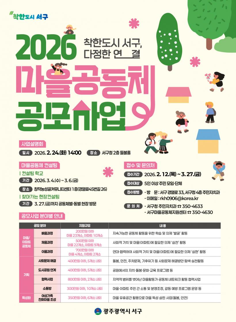 ¼±¸´Â ¿À´Â 24ÀÏ Áֹμ³¸íȸ¸¦ ¿¾î °ø¸ð ºÐ¾ßº° ¼¼ºÎ ÃßÁø°èȹ°ú ¸¶À»°øµ¿Ã¼ ÄÁ¼³ÆÃ ÀÏÁ¤À» ¾È³»ÇÑ´Ù. °ø¸ð»ç¾÷¿¡ °ü½É ÀÖ´Â ÁֹΠ´©±¸³ª Âü¼®ÇÒ ¼ö ÀÖ´Ù. ¶Ç 3¿ù4ÀϺÎÅÍ 3Àϰ£ ¸¶À»°øµ¿Ã¼ ÄÁ¼³ÆÃÇб³¿Í ÇöÀåÄÁ¼³ÆÃÀ» ¿î¿µÇÑ´Ù.