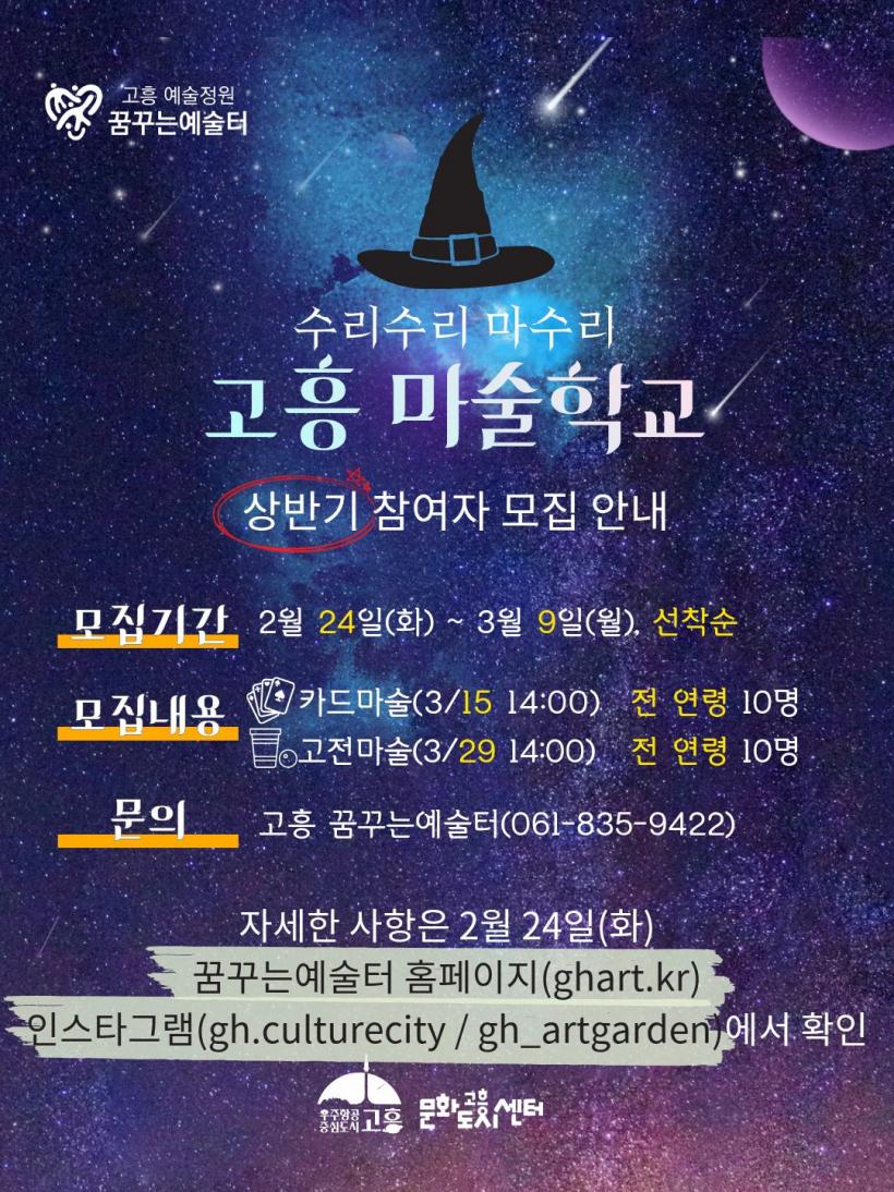 À̹ø »ó¹Ý±â ¡®°íÈï ¸¶¼úÇб³¡¯´Â ¿¬·É¿¡ °ü°è¾øÀÌ ´©±¸³ª ½±°Ô ¹è¿ï ¼ö ÀÖ´Â ¸¶¼úÀ» Áß½ÉÀ¸·Î ±¸¼ºµÆ´Ù. ¼¼ºÎ ÀÏÁ¤Àº ¡ã3¿ù 15ÀÏ Ä«µå¸¶¼ú Æí ¡ã3¿ù 29ÀÏ °íÀü¸¶¼ú(¸µÅ·¸µ, Äžغ¼, µå·Ó ¸µ µî) ÆíÀ¸·Î ¿î¿µµÈ´Ù. °¢ ȸÂ÷´Â ¿ÀÇÁ´× ¸¶¼ú °ø¿¬À» ½ÃÀÛÀ¸·Î ÀÌ·Ð ÇнÀ°ú ½Ç½ÀÀ» ÁøÇàÇÑ µÚ Âü¿©ÀÚÀÇ ¸¶¼ú ¹ßÇ¥·Î ¸¶¹«¸®µÈ´Ù.