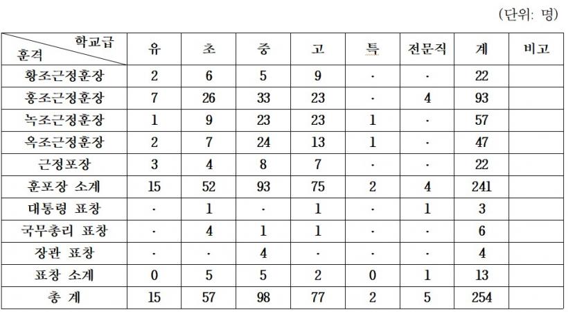À̹ø Á¤ºÎÆ÷»ó ¹× Àå°üǥâ ´ë»óÀÚ´Â À¯¡¤ÃÊ¡¤Áßµî ±³¿ø 254¸íÀ¸·Î, ȲÁ¶±ÙÁ¤ÈÆÀå 22¸í, È«Á¶±ÙÁ¤ÈÆÀå 93¸í, ³ìÁ¶±ÙÁ¤ÈÆÀå 57¸í, ¿ÁÁ¶±ÙÁ¤ÈÆÀå 47¸í, ±ÙÁ¤Æ÷Àå 22¸í, ´ëÅë·Éǥâ 3¸í, ±¹¹«ÃѸ®Ç¥Ã¢ 6¸í, Àå°üǥâ 4¸íÀÌ´Ù.
