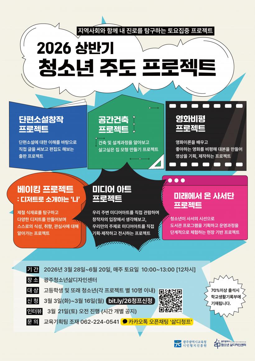 ¡®Ã»¼Ò³â ÁÖµµ ÇÁ·ÎÁ§Æ®¡¯´Â ½Ã¹ÎÇùÄ¡ÁøÈï¿ø°ú ±¤ÁÖû¼Ò³â»îµðÀÚÀμ¾ÅͰ¡ û¼Ò³âµéÀÌ Çб³ ¹Û Àü¹®°¡¿Í ÇÔ²² ´Ù¾çÇÑ ºÐ¾ß¸¦ °æÇèÇÏ¸ç ½º½º·Î ¹Ì·¡¸¦ ¼³°èÇÒ ¼ö ÀÖµµ·Ï µ½±â À§ÇØ Áö³ 2020³âºÎÅÍ ¿î¿µÇϰí ÀÖ´Ù.