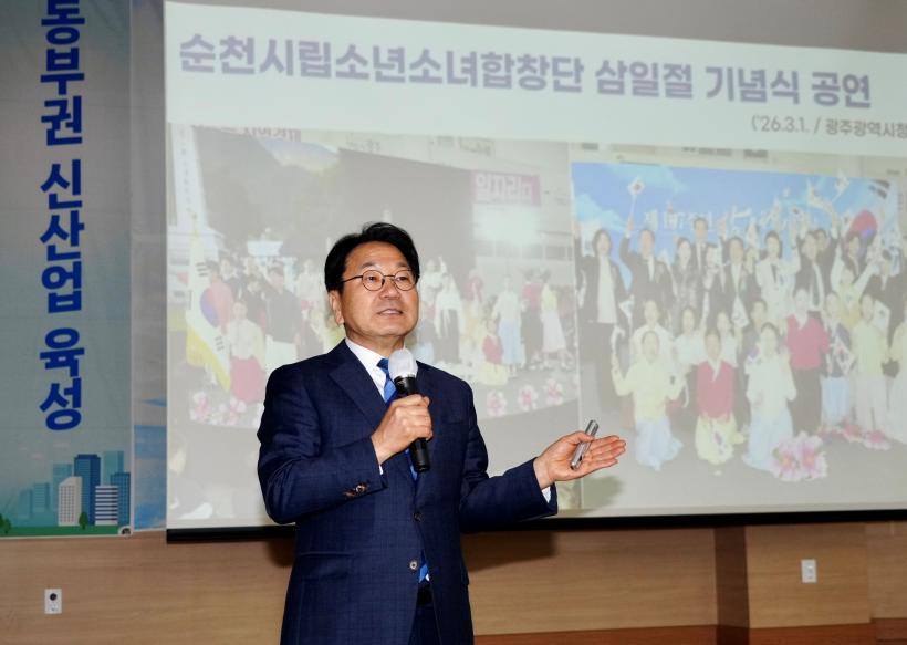 [°ø°£´º½º = ±è¼ö±Ù±âÀÚ] ±¤ÁÖ±¤¿ª½Ã(½ÃÀå °±âÁ¤)´Â 4ÀÏ ±¹¸³¼øÃµ´ëÇб³ ÆÄ·çȦ¿¡¼ ¡®±¤ÁÖ‧Àü³² ÅëÇÕ ¼øÃµ½Ã »ó»ýÅäÅ©¡¯¸¦ ¿°í, Àü³²±¤ÁÖÅëÇÕÆ¯º°½Ã Ãâ¹ü¿¡ µû¸¥ ¼øÃµ µî Àü³² µ¿ºÎ±Ç »ê¾÷¹ßÀü ¹æ¾ÈÀ» Áö¿ª¹Îµé°ú °øÀ¯Çß´Ù.