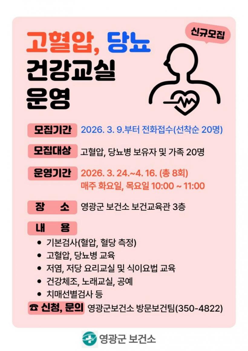 ¸ðÁý ´ë»óÀº °íÇ÷¾Ð¡¤´ç´¢º´ Áø´ÜÀÚ ¶Ç´Â °íÀ§Ç豺 ±º¹Î(´Ü, Àü³âµµ Âü¿©ÀÚ´Â Á¦¿Ü)À̸ç, Âü¿©¸¦ Èñ¸ÁÇÏ´Â °æ¿ì ¿µ±¤±ºº¸°Ç¼Ò ¹æ¹® ¶Ç´Â ÀüÈ(061-350-4822)·Î ½ÅûÇÏ¸é µÈ´Ù. ±³À°ºñ´Â ¹«·áÀÌ´Ù.