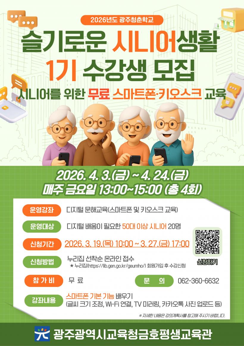 ±³À°Àº 50¼¼ ÀÌ»ó ½Ã´Ï¾îÀÌ¸é ´©±¸³ª Âü¿© °¡´ÉÇϸç, ÃÑ 4±â¿¡ °ÉÃÄ ÁøÇàµÈ´Ù. °¢ ±â¼ö´Â 20¸íÀ¸·Î ±¸¼ºµÇ¸ç, 1°³¿ù °úÁ¤(4ȸ)ÀÇ ±³À°À» ¹Þ°Ô µÈ´Ù. ±³À°Àº ¸ÅÁÖ ±Ý¿äÀÏ ±ÝÈ£Æò»ý±³À°°ü¿¡¼ ÁøÇàµÈ´Ù.