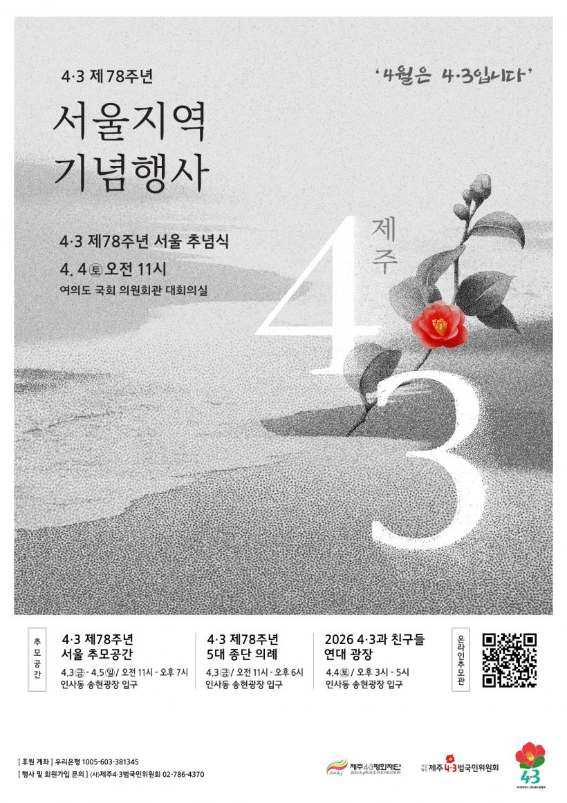 À̾î 5ÀÏ(Åä) ¿ÀÈÄ 3½ÃºÎÅÍ °°Àº ¼ÛÇö±¤Àå ÀÔ±¸¿¡¼ 2026 4.3°ú Ä£±¸µé ¿¬´ë±¤ÀåÀÌ ÆîÃÄÁø´Ù. ¿¹³â ¼ö¹é ¸íÀÇ ÀÎÆÄ¿Í ÁøÇàÇß´ø ¿¬´ë±¤ÀåÀº ¿ÃÇØ¿¡µµ Àü±¹½Ã»ç¸¸ÈÇùȸ ¸¸È°¡µé°ú 4.3À» »ý°¢ÇÏ´Â ¼Õ±Û¾¾ ¸ðÀÓ, 4.3ÆòÈÀαDZ³À° °»çµéÀÌ Ä³¸®Ä¿Ã³ ±×¸®±â, ¼Õ±Û¾¾ ¾²±â, µ¿¹é²É ¸¸µé±â µî Âü¿©Çü Çà»ç¸¦ ÅëÇØ ÁÖ¸» ¿ÀÈÄ Àλ絿°ú ¼ÛÇö±¤ÀåÀ» ã´Â ÀÏ¹Ý ½Ã¹Î°ú ¿Ü±¹ÀÎ µéÀ» ´ë»óÀ¸·Î ½±°í Ä£¼÷ÇÏ°Ô 4.3À» ¾Ë·Á³ª°¥ ¿¹Á¤ÀÌ´Ù.