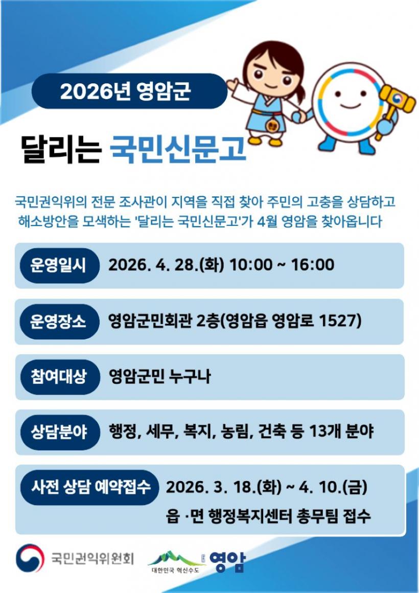 À̹ø ±¹¹Î½Å¹®°í´Â ¿À´Â 4¿ù 28ÀÏ ¿ÀÀü 10½ÃºÎÅÍ ¿ÀÈÄ 4½Ã±îÁö ¿µ¾Ï±º¹Îȸ°ü¿¡¼ ¿¸°´Ù. ±¹¹Î±ÇÀÍÀ§¿øÈ¸ Àü¹® Á¶»ç°üÀÌ Á÷Á¢ ÇöÀåÀ» ã¾Æ ÇàÁ¤¡¤º¹Áö»Ó ¾Æ´Ï¶ó »ýȰ¹ý·ü, ¼¹Î±ÝÀ¶, ¼ÒºñÀÚ ÇÇÇØ±¸Á¦ µî ´Ù¾çÇÑ ºÐ¾ßÀÇ ¹Î¿øÀ» »ó´ãÇÑ´Ù.