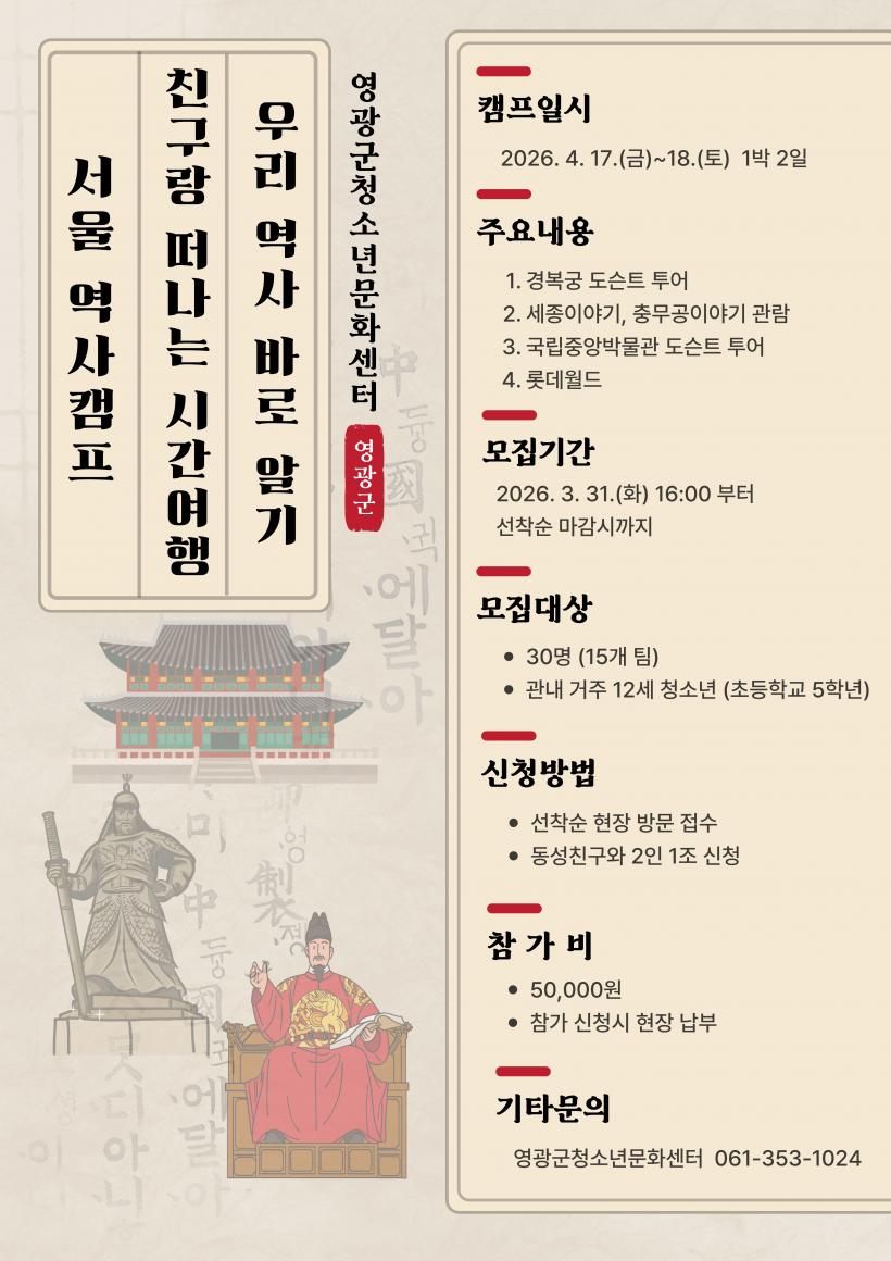 À̹ø Ä·ÇÁ´Â ¿À´Â 4¿ù 17ÀϺÎÅÍ 18ÀϱîÁö 1¹Ú 2Àϰ£ ÁøÇàµÇ¸ç, ¿µ±¤±º °ü³» ÃʵîÇб³ 5Çгâ û¼Ò³â 30¸íÀ» ´ë»óÀ¸·Î ¼¿ïÀÇ ÁÖ¿ä ¿ª»ç¡¤¹®È ¸í¼Ò¸¦ ޹æÇÑ´Ù.