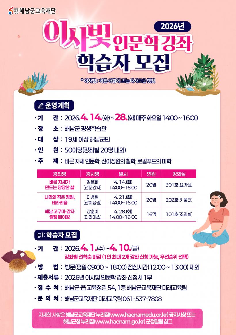 ÇØ³²±º±³À°Àç´ÜÀº ¡®Çس² ÀÌ»çºû Àι®ÇÐ °Á¡¯¸¦ ÅëÇØ ±º¹ÎÀÇ Àι®ÇÐÀû ÀÌÇØ¿Í °Ç° ÁõÁø, Áö¿ª ¹®È Ȱ¼ºÈ¸¦ µµ¸ðÇÏ°í ¾ÕÀ¸·Îµµ Æò»ý±³À° ÇÁ·Î±×·¥À» È®´ëÇØ ±º¹Î ÇнÀ±Ç º¸Àå°ú »îÀÇ Áú Çâ»ó¿¡ ±â¿©ÇÒ °èȹÀÌ´Ù.