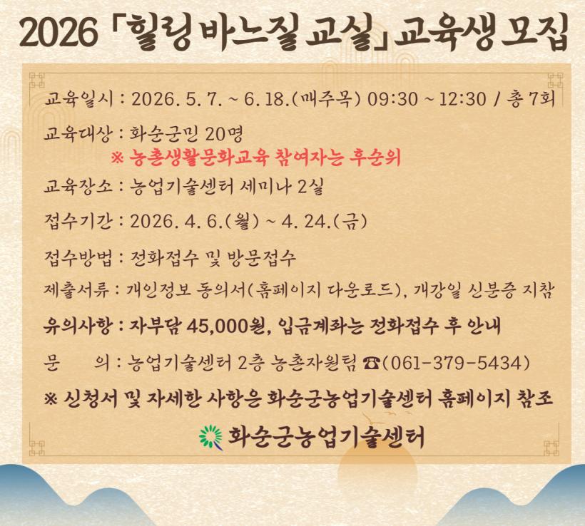 À̹ø ±³À°Àº 5¿ù 7ÀϺÎÅÍ 6¿ù 18ÀϱîÁö ³ó¾÷±â¼ú¼¾ÅÍ¿¡¼ ¸ÅÁÖ ¸ñ¿äÀÏ ÃÑ 7ȸ¿¡ °ÉÃÄ ÁøÇàµÇ¸ç, ȼø±º¹Î 20¸íÀ» ¸ðÁýÇÑ´Ù. ±³À°ºñ´Â ¹«·áÀ̸ç, Àç·áºñ´Â ÀϺΠÀںδãÀÌ´Ù.