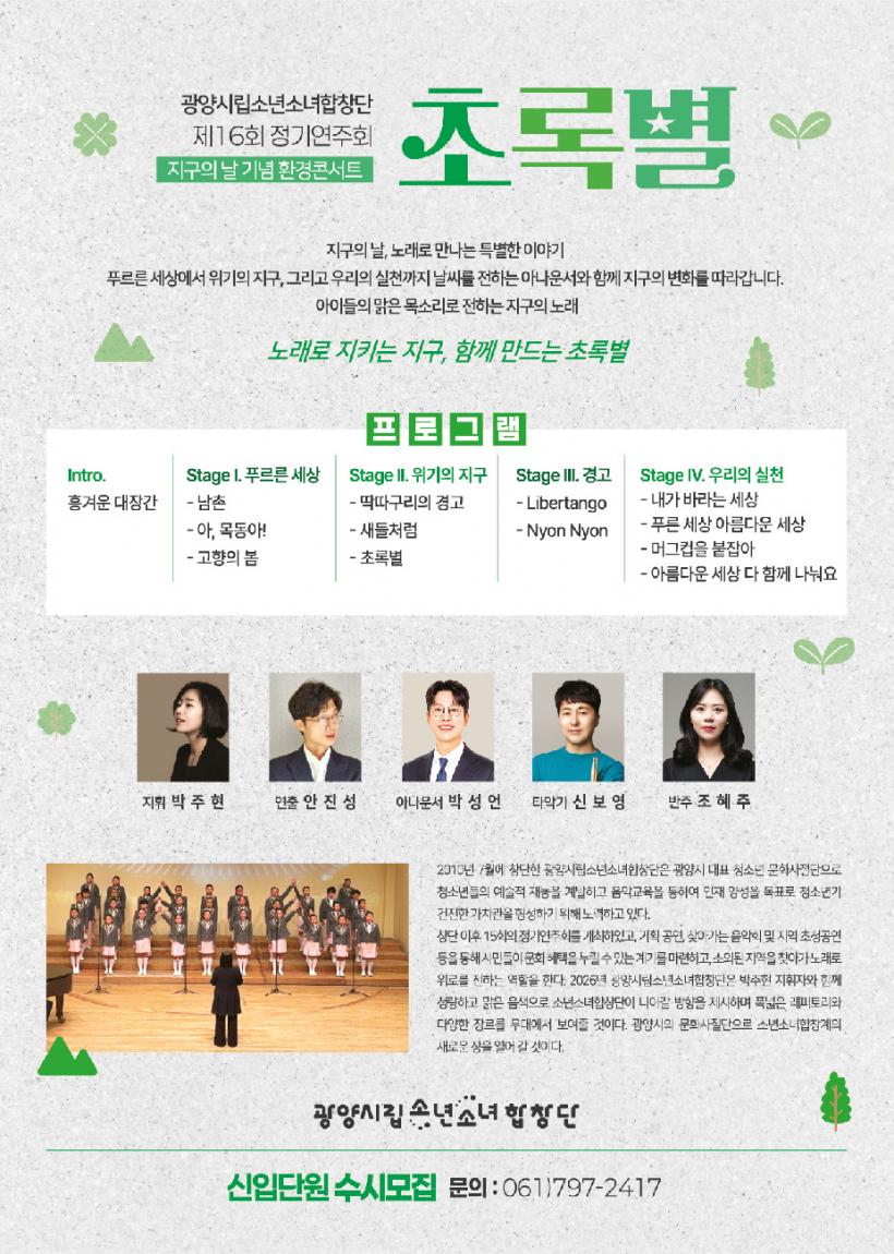 ±¤¾ç½Ã¸³¼Ò³â¼Ò³àÇÕâ´ÜÀº À̹ø ¹«´ë¿¡¼ Áö±¸ »ç¶û°ú ȯ°æº¸È£ÀÇ ¸Þ½ÃÁö¸¦ ´ã¾Æ °ü°´µé¿¡°Ô ½ÇõÀÇ Á߿伺À» ÀüÇÒ ¿¹Á¤ÀÌ´Ù.