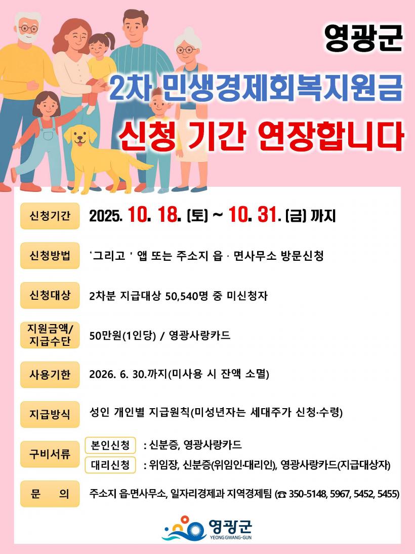 2Â÷ Áö±Þ´ë»ó 50,540¸í Áß ¹Ì½ÅûÀÚ°¡ ´ë»óÀ̸ç, Áö±Þ ±âÁØÀÏÀÎ 2024³â 12¿ù 27ÀϺÎÅÍ ½ÅûÀϱîÁö °è¼ÓÇØ¼ ¿µ±¤±º¿¡ ÁÖ¼Ò¸¦ µÐ ±º¹ÎÀ¸·Î, Áö±Þ±âÁØÀÏ ´ÙÀ½³¯(2024. 12. 28.)ºÎÅÍ ÀüÃâ, »ç¸Á, ¸»¼Ò, °ÅÁÖºÒ¸í µîÀÇ »çÀ¯°¡ ¹ß»ýÇÑ °æ¿ì¿¡´Â Áö±Þ´ë»ó¿¡¼ Á¦¿ÜµÈ´Ù.