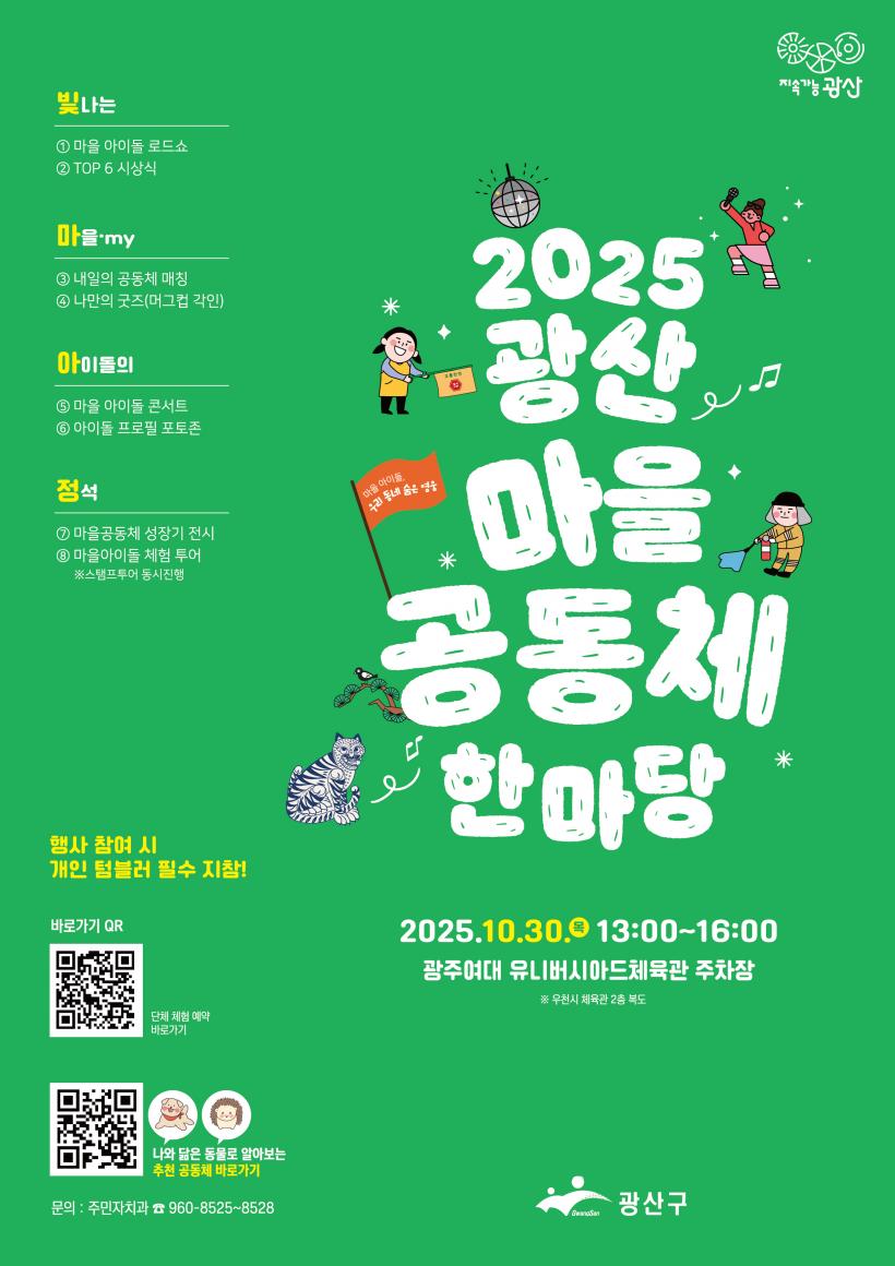 ±¤»ê¸¶À»°øµ¿Ã¼ÇѸ¶´çÀº ¡®¸¶À» ¾ÆÀ̵¹, ¿ì¸® µ¿³× ¼ûÀº ¿µ¿õ¡¯À» ÁÖÁ¦·Î 2025³â ±¤»êÇü ¸¶À»°øµ¿Ã¼ Áö¿ø»ç¾÷ Áֹΰø¸ð»ç¾÷¿¡ ¼±Á¤µÈ ´ÜüµéÀÌ ÀڽŵéÀÇ È°µ¿À» ±æ°Å¸® °ø¿¬, °¢Á¾ üÇè, Àü½Ã µî ´Ù¾çÇÑ ¹æ½ÄÀ¸·Î ¼±º¸ÀÌ´Â Çà»ç´Ù.