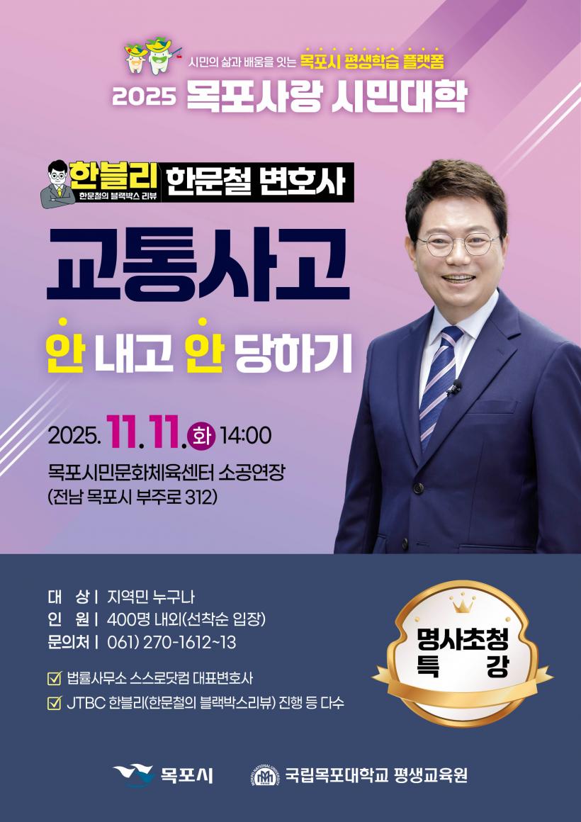 À̹ø °¿¬Àº ¸ñÆ÷½Ã¿Í ±¹¸³¸ñÆ÷´ëÇб³°¡ °øµ¿ ¿î¿µÇÏ´Â ¡®¸ñÆ÷»ç¶û ½Ã¹Î´ëÇС¯ °ÁÂÀÇ ÀÏȯÀ¸·Î ¸¶·ÃµÆ´Ù. JTBC ¡®ÇÑºí¸®(Çѹ®Ã¶ÀÇ ºí·¢¹Ú½º ¸®ºä)¡¯·Î Àß ¾Ë·ÁÁø Çѹ®Ã¶ º¯È£»ç´Â ±³Åë»ç°í ó¸® ºÐ¾ßÀÇ ´ëÇ¥ÀûÀÎ Àü¹®°¡·Î, ½ÇÁ¦ »ç°í ¿µ»ó°ú ÆÇ·Ê¸¦ ÅëÇØ ¹ýÀû Ã¥ÀÓ ºñÀ², »ç°í ´ëó ¿ä·É µî Àϻ󿡼 µµ¿òÀÌ µÇ´Â ±³Åë¹ý·ü Á¤º¸¸¦ ¾Ë±â ½±°Ô ÀüÇÒ ¿¹Á¤ÀÌ´Ù.