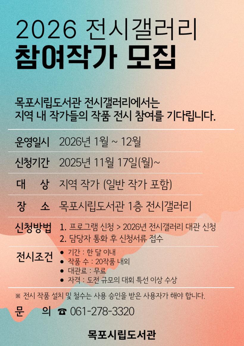 2026³â 1¿ùºÎÅÍ 12¿ù±îÁö ÁøÇàµÇ´Â ÀÛǰ Àü½Ã´Â Áö¿ª ÀÛ°¡¸¦ ºñ·ÔÇÑ ÀÏ¹Ý ÀÛ°¡¸¦ ´ë»óÀ¸·Î Çϸç, 11¿ù 17ÀÏ(¿ù)ºÎÅÍ ¸ñÆ÷½ÃÅëÇÕµµ¼°ü ´©¸®Áý(https://www.mokpolib.or.kr)À» ÅëÇØ ½ÅûÇÒ ¼ö ÀÖ´Ù. ½Åû ¼ø¼¿¡ µû¶ó ÀÏÁ¤À» Á¶Á¤ÇØ Àü½Ã°¡ ÁøÇàµÉ ¿¹Á¤ÀÌ´Ù.