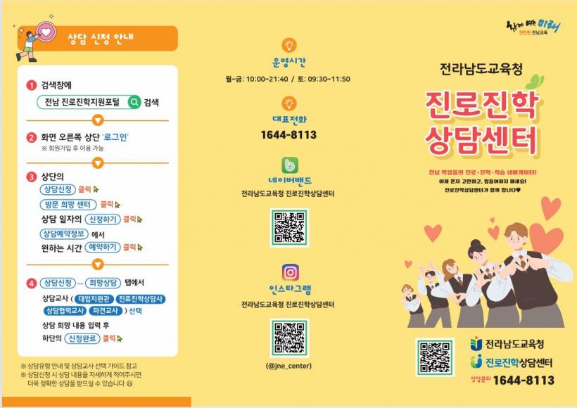 ÇÑÆí, Àü³²±³À°Ã» Áø·ÎÁøÇлó´ã¼¾ÅÍ´Â ¿¬Áß Áø·Î¡¤ÁøÇÐ »ó´ãÀ» ¿î¿µÇϸç, ¼ö½Ã¡¤Á¤½Ã ´ëºñ ÇÁ·Î±×·¥, ¸ðÀǸéÁ¢, Çкθð Áø·ÎÁøÇÐ ¾ÆÄ«µ¥¹Ì µî ´Ù¾çÇÑ Áø·ÎÁøÇÐ Áö¿ø Á¤Ã¥À» Áö¼Ó ÃßÁøÇϰí ÀÖ´Ù.