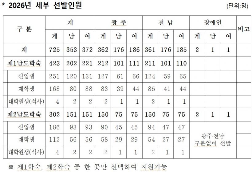 ¼±¹ß ÀοøÀº ±¤ÁÖ 362¸í, Àü³² 361¸íÀ̸ç, Àå¾ÖÀÎ 2¸íÀº ½Ã¡¤µµ ±¸ºÐ ¾øÀÌ ¼±¹ßÇÑ´Ù. Çм÷º°·Î´Â Á¦1³²µµÇм÷(µ¿ÀÛ±¸ ¼ÒÀç) 423¸í, Á¦2³²µµÇм÷(ÀºÆò±¸ ¼ÒÀç) 302¸íÀ̸ç, º»ÀÎÀÌ Èñ¸ÁÇÏ´Â °÷À» ¼±ÅÃÇØ Áö¿øÇÏ¸é µÈ´Ù.