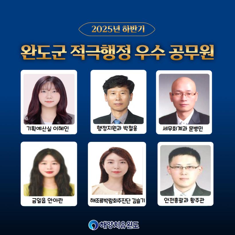 Àû±Ø ÇàÁ¤ ¿ì¼ö °ø¹«¿ø¿¡´Â ±âȹ¿¹»ê½Ç ÀÌÇýÀÎ ÁÖ¹«°ü, ÇàÁ¤Áö¿ø°ú Ȳö¿õ ÆÀÀå, ¼¼¹«È¸°è°ú ¹®º´¹Î ÆÀÀå, ±ÝÀÏÀ¾ ¾È¾Æ¶õ ÁÖ¹«°ü, Çù¾÷ÆÀÀº ¼¹«ÆÀ°ú »çȸÀç³ÆÀÀÌ À̸§À» ¿Ã·È´Ù.