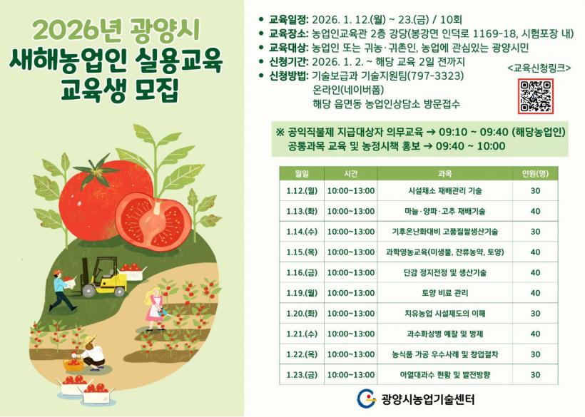 À̹ø ±³À°Àº ±¤¾ç½Ã³ó¾÷±â¼ú¼¾ÅÍ ½ÃÇèÆ÷Àå ³» ³ó¾÷Àα³À°°ü¿¡¼ ÁøÇàµÇ¸ç, ´Ü°¨, ½Ã¼³Ã¤¼Ò ¹× ³ëÁöä¼Ò, Ä¡À¯³ó¾÷, ³ó½Äǰ °¡°ø â¾÷, ¾Æ¿´ë°ú¼ö µî ÃÑ 10°³ÀÇ Àü¹®°úÁ¤À¸·Î ¿î¿µµÉ ¿¹Á¤ÀÌ´Ù.