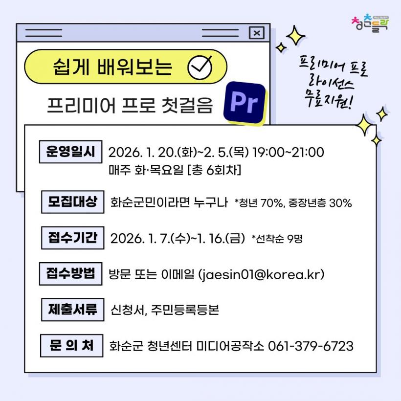 ½ÅûÀº ½Åû¼¿Í ÇÔ²² Áֹεî·Ïµîº»À» Á¦ÃâÇØ¾ß Çϸç, 1¿ù 16ÀϱîÁö ȼø±º û³â¼¾Å͸¦ ¹æ¹®Çϰųª °ø½Ä ȨÆäÀÌÁö(https://www.hwasun.go.kr/youth)¸¦ ÅëÇØ ½ÅûÇÏ¸é µÈ´Ù.