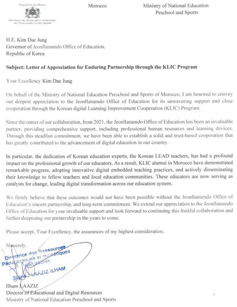 À̹ø °¨»ç ¼ÇÑÀº Àü¶ó³²µµ±³À°Ã»ÀÌ 2021³âºÎÅÍ ±³À° Á¤º¸È Áö¿ø »ç¾÷ (KLIC‧Korean Digital-Learning Improvement Cooperation)À» ÅëÇØ ¸ð·ÎÄÚ ±³À°ºÎ¿Í µðÁöÅÐ ±³À° ºÐ¾ß¿¡¼ Áö¼ÓÀûÀÎ Çù·ÂÀ» À̾î¿Â µ¥ ´ëÇÑ Æò°¡¸¦ ´ã°í ÀÖ´Ù. ¸ð·ÎÄÚ ±³À°ºÎ´Â ¼ÇÑÀ» ÅëÇØ Àü³²±³À°Ã»ÀÌ ´Ü±âÀû Áö¿øÀ» ³Ñ¾î Àå±âÀû °üÁ¡¿¡¼ Çù·ÂÀ» À̾î¿Â Á¡¿¡ ±íÀº °¨»ç¸¦ Ç¥Çß´Ù.
