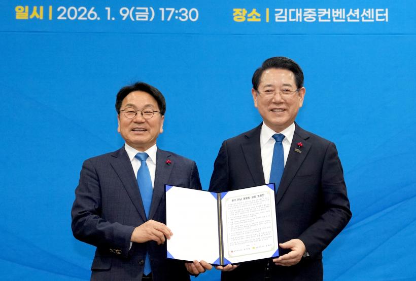 ÀÌÀç¸í ´ëÅë·ÉÀº ¡°½¬¿î ÀÏÀÌ ¾Æ´Ñ ÅëÇÕÀ» ´ë½ÂÀû Â÷¿ø¿¡¼ ÃßÁø ÁßÀÎ µÎ ´ÜüÀåÀÇ °á´Ü¿¡ °¨»çµå¸°´Ù¡±¸ç ¡°´ëÇѹα¹ ¹ÎÁÖÁÖÀÇ ¹ßÀü¿¡ ±â¿©Çؿ ±¤ÁÖ¡¤Àü³²ÀÌ »õ·Î¿î Àü±â¸¦ ¸ÂÀÌÇÒ ¼ö ÀÖµµ·Ï ÀçÁ¤¡¤»ê¾÷¡¤ÇàÁ¤ Àü¹Ý¿¡ °ÉÄ£ ´ëÆøÀûÀÎ Áö¿øÀ» Çϰڴ١±°í ¾à¼ÓÇß´Ù.