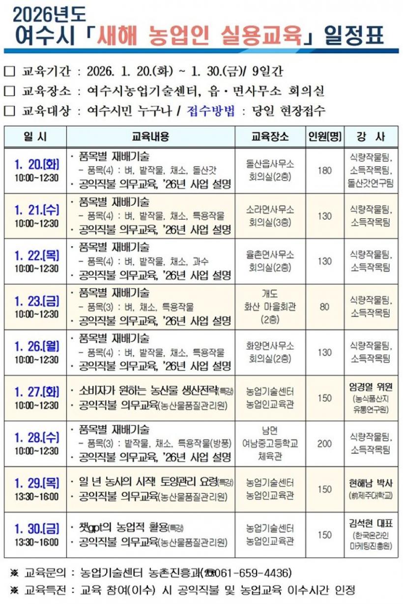 ÁÖ¿ä ±³À°³»¿ëÀº Áö¿ªº° ƯÈÀÛ¹°¿¡ µû¶ó ¡ã½Ä·®ÀÛ¹°(º, ¹çÀÛ¹°) ¡ã¿ø¿¹(ä¼Ò, °ú¼ö, µ¹»ê°«) ¡ãƯÀÛ(Âü±ú, ¹æÇ³) ¡ãÁÖ¿ä ³ó¾÷Á¤Ã¥(°øÀÍÁ÷ºÒÁ¦, PLS, ³ó¾÷eÁö)À¸·Î ±¸¼ºµÇ¸ç, ÀÌ ¿Ü¿¡ ¡®³ó»ê¹° »ý»êÀü·«¡¯, ¡®Åä¾ç°ü¸® ¿ä·É¡¯, ¡®ÃªGPTÀÇ ³ó¾÷Àû Ȱ¿ë¡¯À» ÁÖÁ¦·Î ÇÑ Æ¯°µµ ÇÔ²² ¸¶·ÃÇß´Ù.