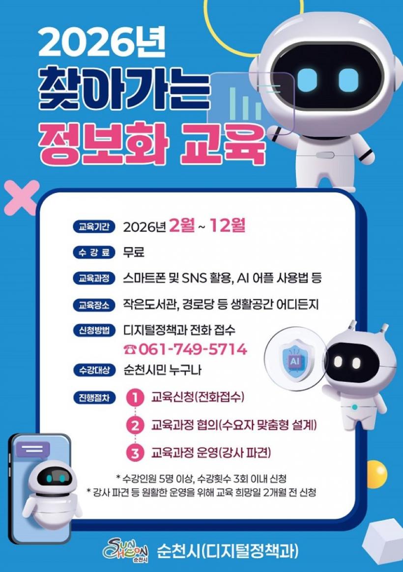ÁýÇÕ ±³À°Àº ½Ãû Àü»ê ±³À°Àå¿¡¼ ¿ùº° ÀÏÁ¤¿¡ µû¶ó ¿î¿µµÈ´Ù. ƯÈ÷, ¿ÃÇØ´Â AI °úÁ¤ÀÌ »õ·Ó°Ô Ãß°¡µÇ¾î Ãֽбâ¼úÀ» ½±°í ÆíÇÏ°Ô ¹è¿ï ¼ö ÀÖµµ·Ï ÇÁ·Î±×·¥À» °ÈÇß´Ù. ±³À° ½ÅûÀº ¸Å¿ù ¸¶Áö¸· ÁÖ ¿ù¿äÀÏ ÀüÈ(061-749-5714) ¶Ç´Â ±× ÀüÁÖ ¿ù¿äÀϺÎÅÍ ½Ã ȨÆäÀÌÁö ¡®¹Ù·Î¿¹¾à¡¯À» ÅëÇØ ½ÅûÇÏ¸é µÈ´Ù.